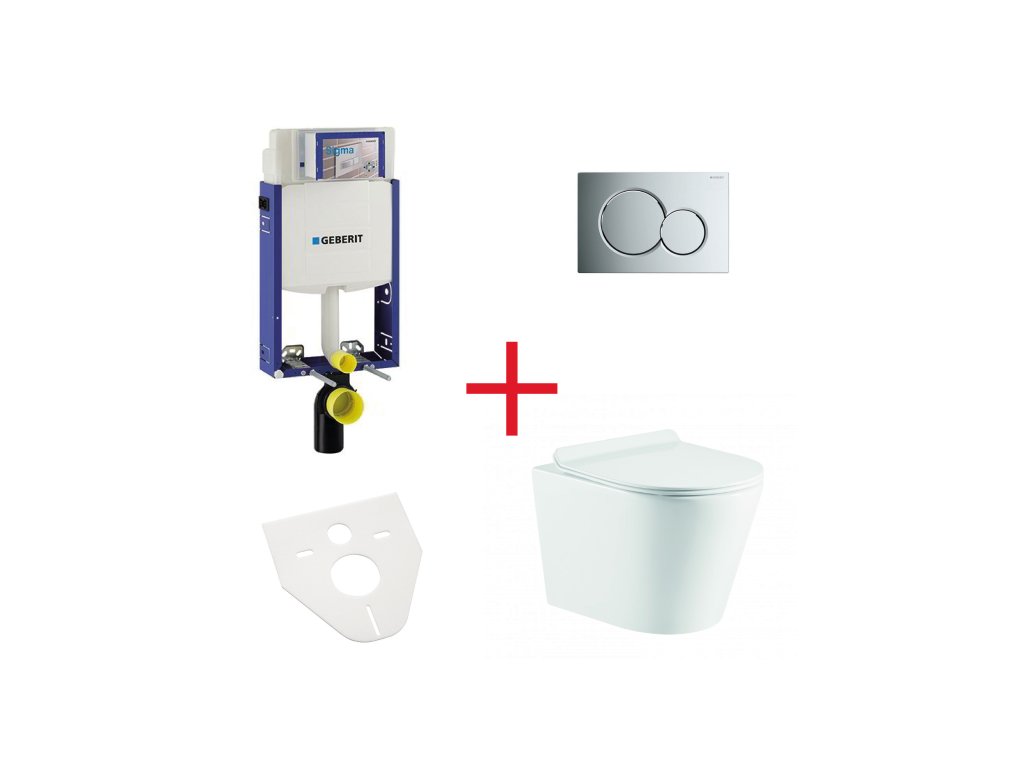 Kompletní WC set obsahující: závěsné WC OVALE BASSO s moderním RIMLESS systémem včetně SLIM sedátka se systémem SOFT-CLOSE, předstěnový modul, podložku, splachovací tlačítko GEBERIT Sigma 01.