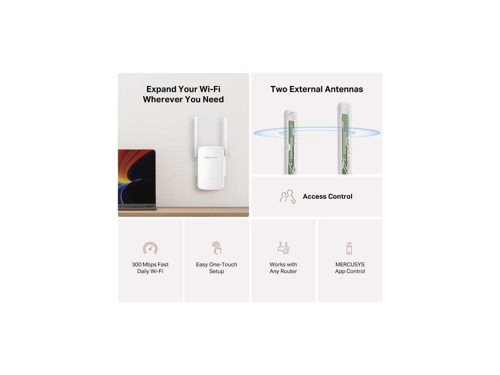 Wi-Fi extender podporuje připojení k libovolnému routeru nebo přístupovému bodu. Kromě jednoduchého fyzického ovládání je dostupná i mobilní aplikace MERCUSYS, se kterou nastavíte a spravujete Wi-Fi jednoduše z telefonu.