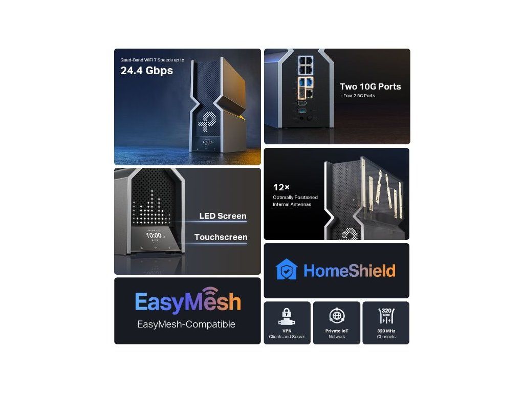 - Pokročilé funkce: 320MHz kanál, 4K-QAM, kompatibilita s EasyMesh, IoT Network, spolupráce s Google Assistant a Alexa)