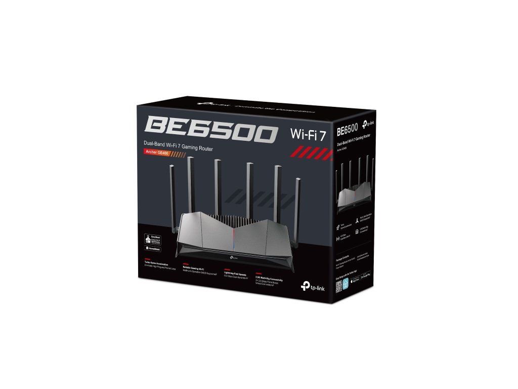 Router TP-Link Archer GE400 je navržený pro hráče, kteří nechtějí dělat kompromisy. Nabízí duální pásmo Wi-Fi 7 s kombinovanou rychlostí až 6,5 Gb/s, vylepšené technologií 4K-QAM a Multi-Link Operation pro stabilní připojení i během náročných online her. Díky šesti externím anténám s Beamformingem pokryje bez problémů i větší domácnost.