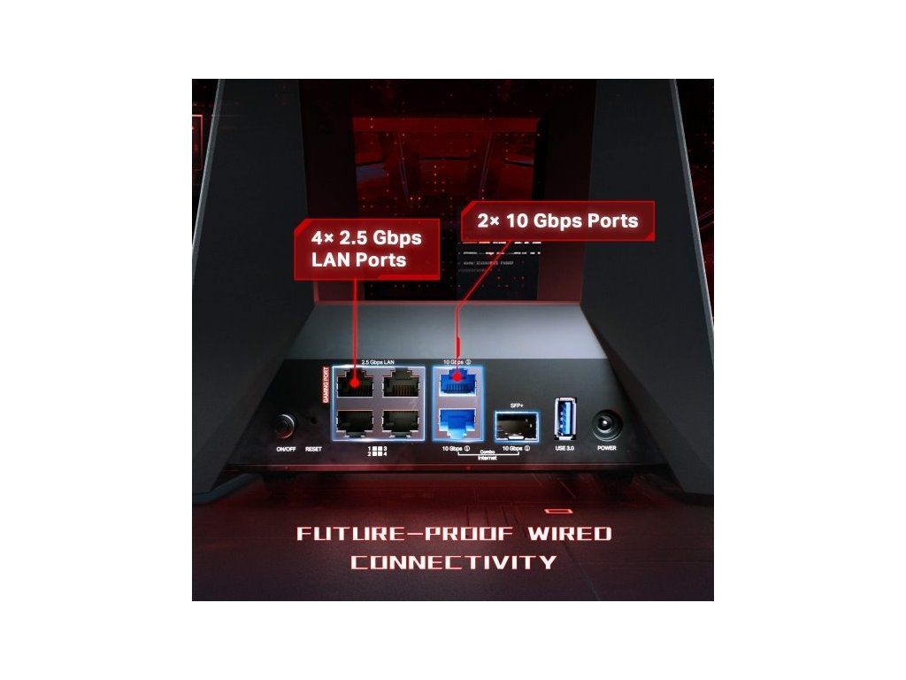 Na routeru najdete 1x 10 Gb/s LAN/WAN port SFP Combo, 4x 2,5 Gb/s LAN porty, 1x 10 Gb/s LAN port a jeden USB 3.0 port. Rozšiřují konektivitu a zajišťují flexibilní využití zařízení. Těšit se můžete na 4,8x větší rychlost, 4x nižší latenci a až 2x větší kapacitu sítě než u modelů s Wi-Fi 6/6E. Router podporuje velkou šířku pásma pro kabelové připojení zařízení. 10G LAN porty s až 10x rychlejším přenosem dat jsou ideální pro připojení herních notebooků či konzolí.