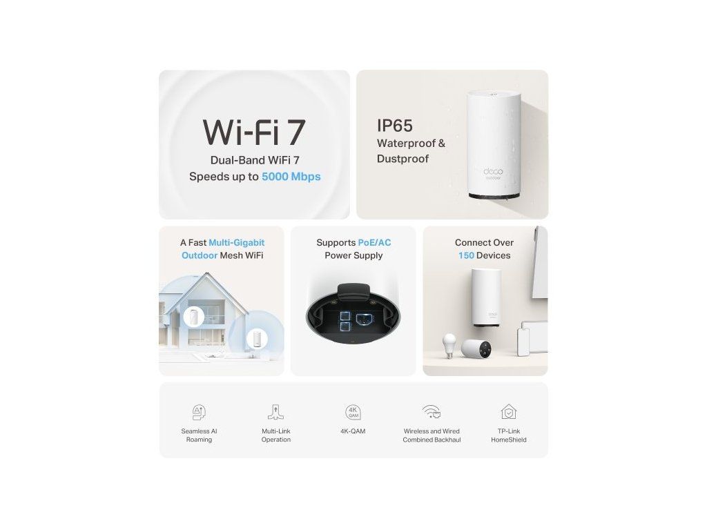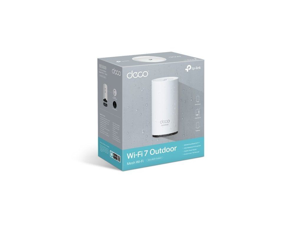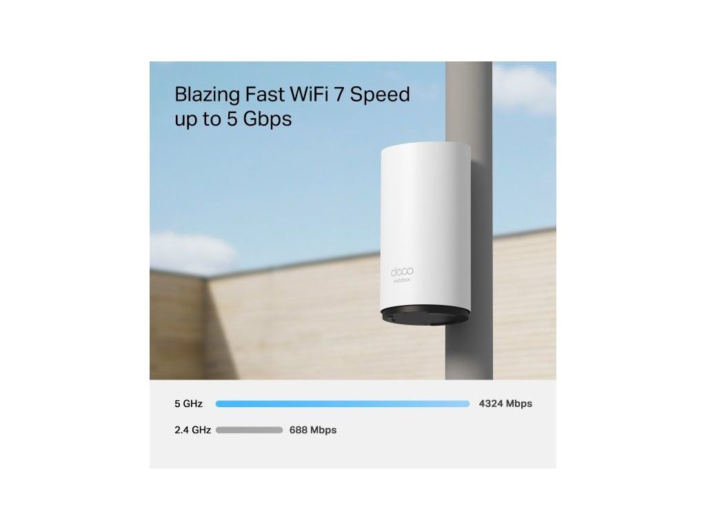 Výkonný venkovní router TP-Link Deco BE25-Outdoor podporuje Wi-Fi 7. Díky pokročilé technologii vám zajistí extrémně rychlé bezdrátové připojení až 3,6 Gb/s. Využijete ho v domácnosti, firmě i na veřejném venkovním prostranství. Jednotka je vybavena dvěma 2.5Gbps porty s PoE, což zajišťuje nejen rychlý přenos dat, ale také napájení jediným kabelem.