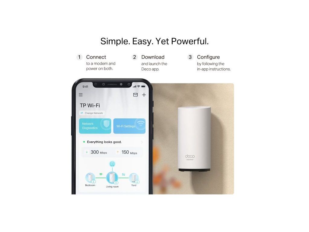 Instalace jednotky je rychlá a pohodlná díky mobilní aplikaci TP-Link Deco. Nastavení zvládnete ve třech jednoduchých krocích. Přes aplikaci také spravujete připojená zařízení, sledujete síťový provoz nebo vytvoříte síť pro hosty. Díky podpoře PoE odpadá nutnost samostatného napájecího kabelu.