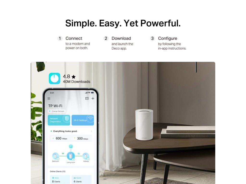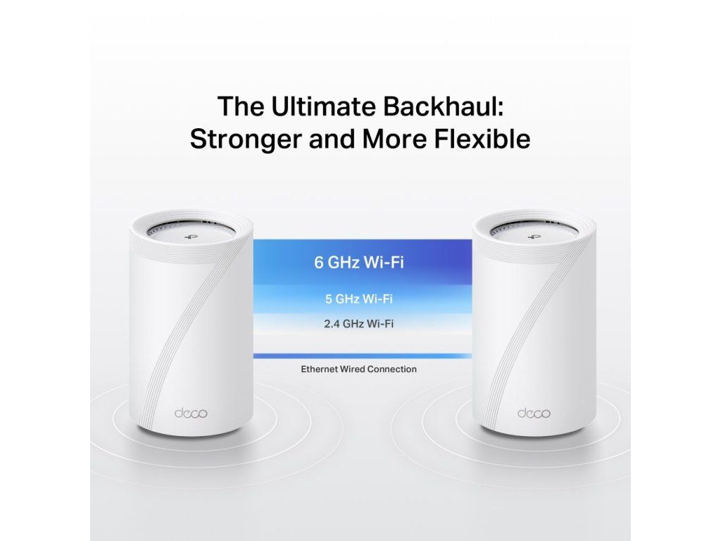 Tři jednotky vytvoří jednotnou síť s jedním názvem a pokrytím až 750 m2. Technologie AI Mesh a plynulý roaming zajistí automatické přepínání mezi jednotkami bez výpadků signálu. Systém podporuje kombinovaný bezdrátový i kabelový backhaul pro maximální stabilitu a nízkou latenci.