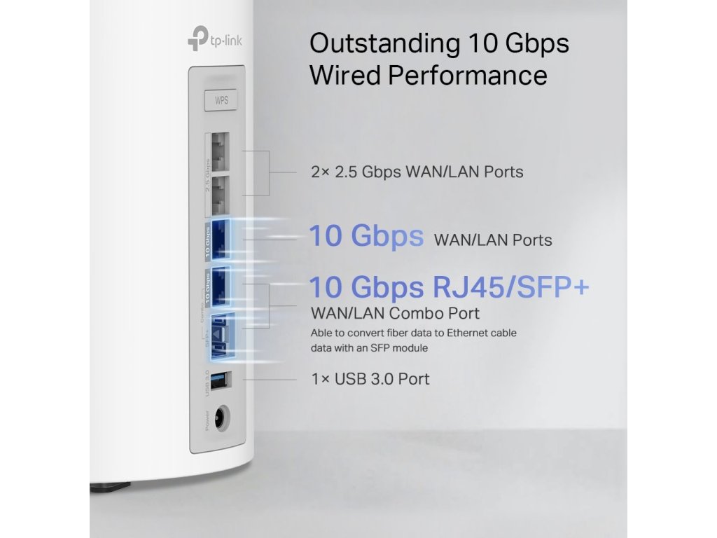- Ethernet porty: 1x 10 Gbps, 1x 10 Gbps SFP+/RJ45 Combo, 2x 2,5 Gbps (na jednu jednotku Deco)