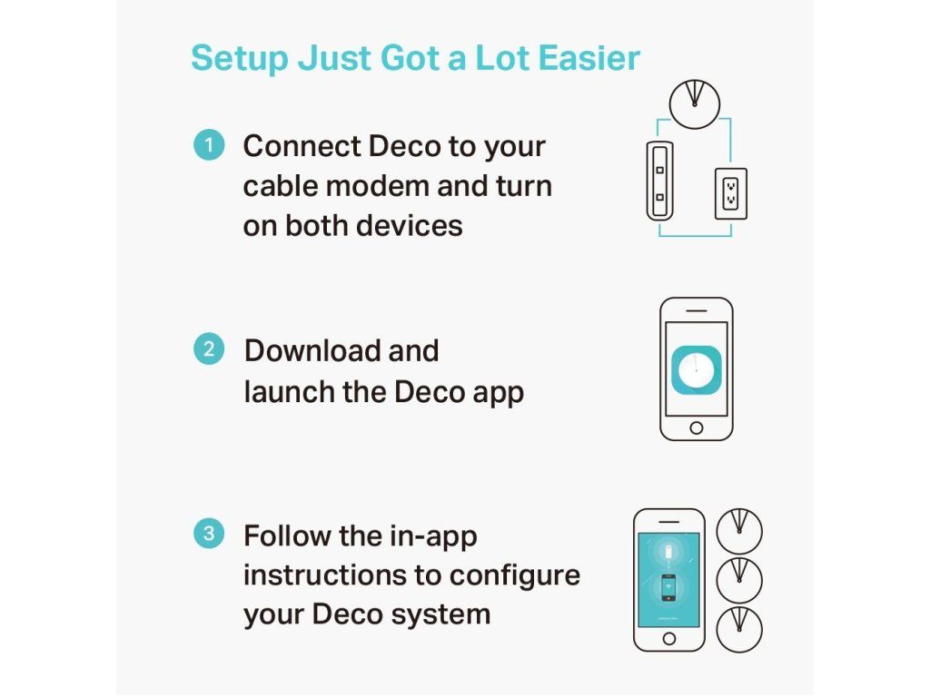 WiFi router TP-Link Deco je řešení Wi-Fi sítě pro celý dům, které má nejkomplexnější zabezpečení. Poskytuje rychlý nepřerušovaný Wi-Fi signál pro každou místnost díky tomu, že využije výkon jendé samostatné jednotky AC1300 pro souvislé pokrytí plochy až 420 m2. Nastavení Deco je snadné a systém může růst spolu s tím, jak budete svou domácnost vybavovat dalšími zařízeními. A na systém Deco se vztahuje v daném oboru jedinečná doživotní nepřetržitá podpora.Wi-Fi pro celý dům, bezpečnost pro celý dům