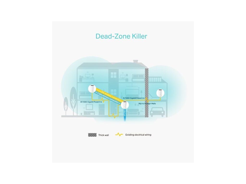 Hybridní systém pro celý dům poskytuje rozšířené pokrytí až do plochy 370 m2 (dvě pásma Wi-Fi a elektrické vedení). Díky powerline technologii maže oblasti se slabým signálem.