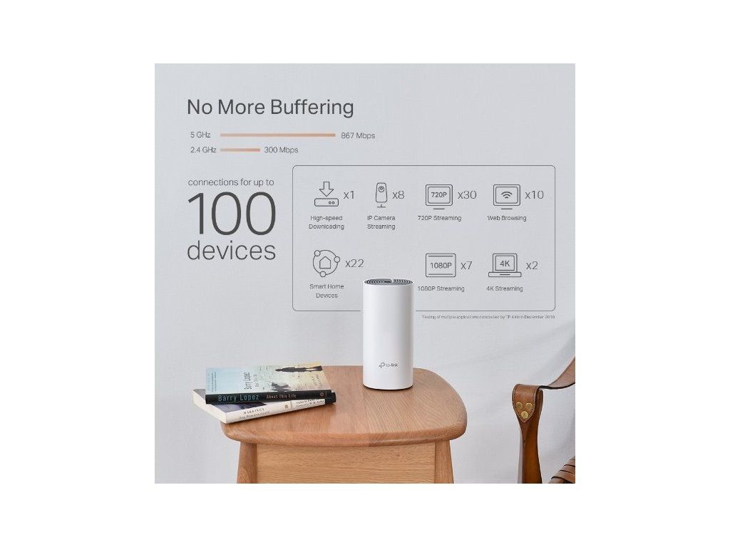 Síťovou rychlost zvládá až třikrát rychlejší než předchozí generace routerů. Díky bezdrátové technologii 802.11ac poskytuje Deco připojení až pro 100 zařízení. Už žádné další ukládání do vyrovnávací paměti a žádné další zpoždění.
