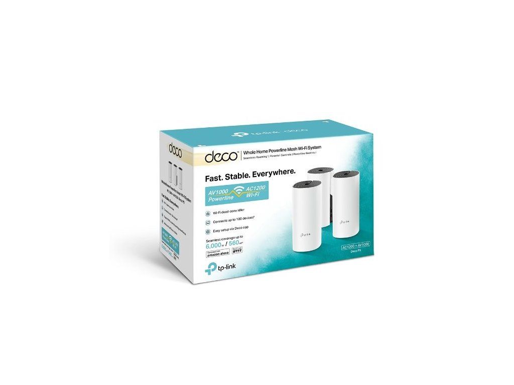 Wi-Fi router Deco P9 (3-pack) značky TP-Link využívá bezdrátové připojení třídy AC1200 a HomePlug AV1000. Hybridní síť (WiFi + PLC Hybrid Mesh) výrazně zesiluje šířku pásma a díky tomu podporuje v připojení až 100 zařízení.