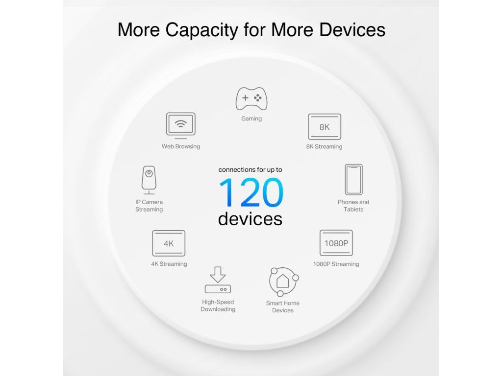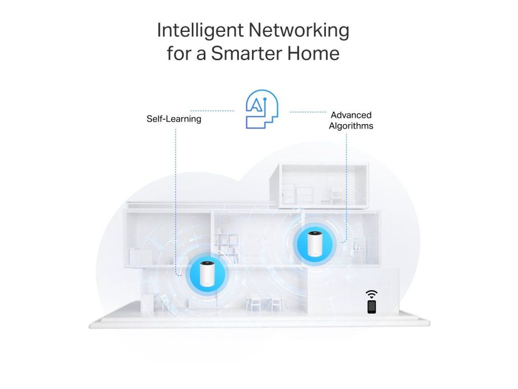 Dvoupásmová WiFi 6 s podporou MU-MIMO a OFDMA umožňuje efektivní komunikaci s více zařízeními současně. Funkce HomeShield poskytuje ochranu IoT zařízení v reálném čase, rodičovskou kontrolu, filtrování obsahu i prevenci DDoS útoků. Systém lze spravovat jednoduše pomocí aplikace Deco.