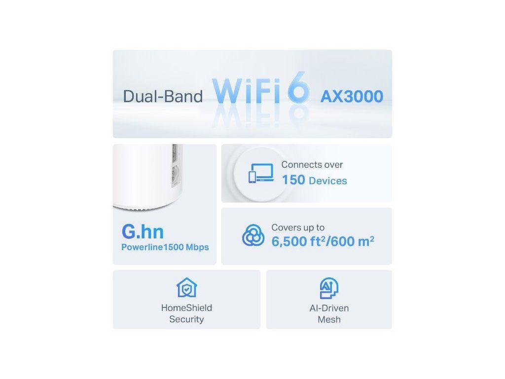 WiFi 6 výrazně zvyšuje pokrytí a celkovou kapacitu připojení. WiFi 6 s Powerline pracují společně při přenosu dat mezi jednotkami Deco, čímž vám poskytují vysokou rychlost. Kapacita je 4x větší a rychlost dosahuje až 3x vyšší hodnoty než u starších technologií.