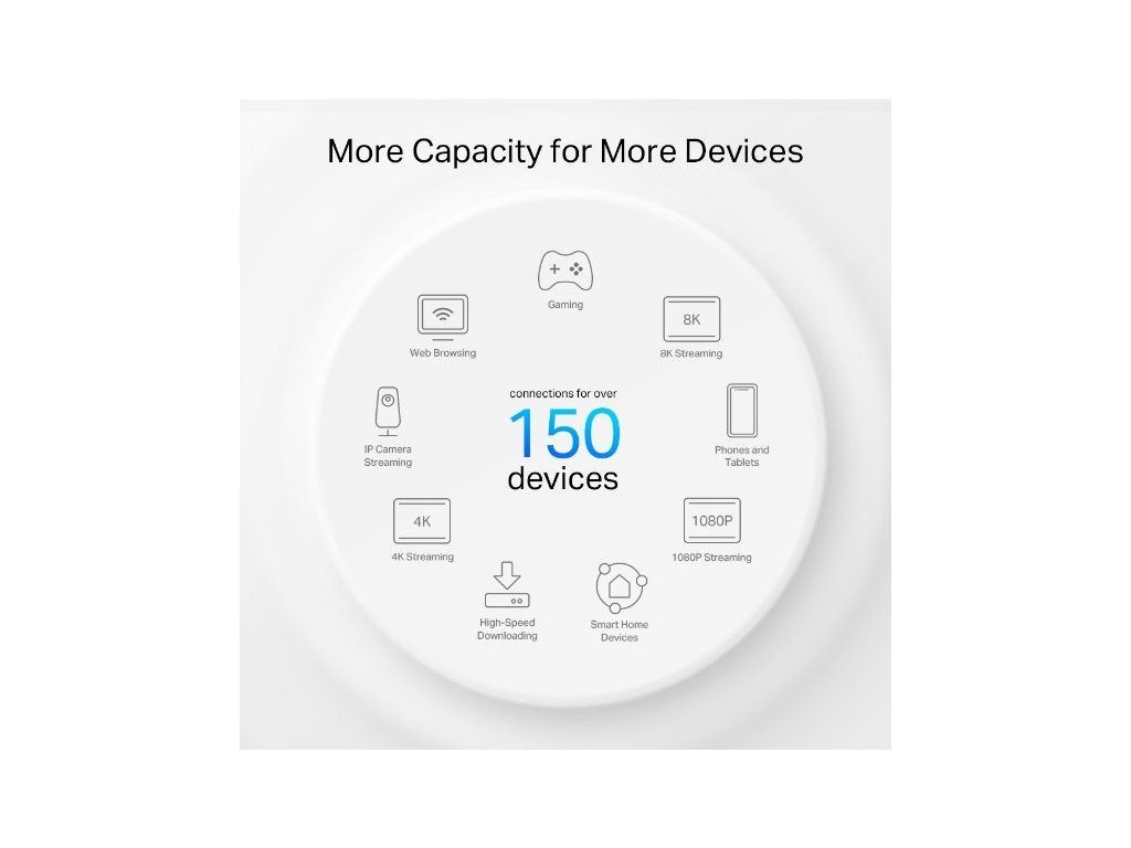 WiFi 6 výrazně zvyšuje pokrytí a celkovou kapacitu připojení. WiFi 6 s Powerline pracují společně při přenosu dat mezi jednotkami Deco, čímž vám poskytují vysokou rychlost. Kapacita je 4x větší a rychlost dosahuje až 3x vyšší hodnoty než u starších technologií.