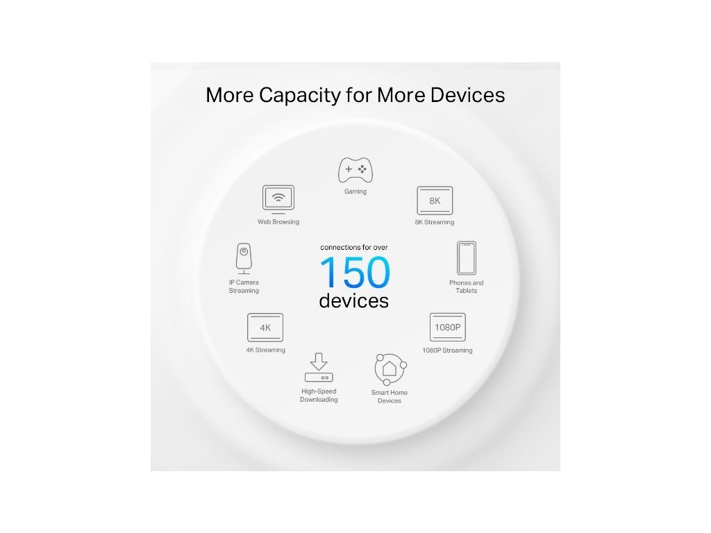 WiFi 6 výrazně zvyšuje pokrytí a celkovou kapacitu připojení. WiFi 6 s Powerline pracují společně při přenosu dat mezi jednotkami Deco, čímž vám poskytují vysokou rychlost. Kapacita je 4x větší a rychlost dosahuje až 3x vyšší hodnoty než u starších technologií.