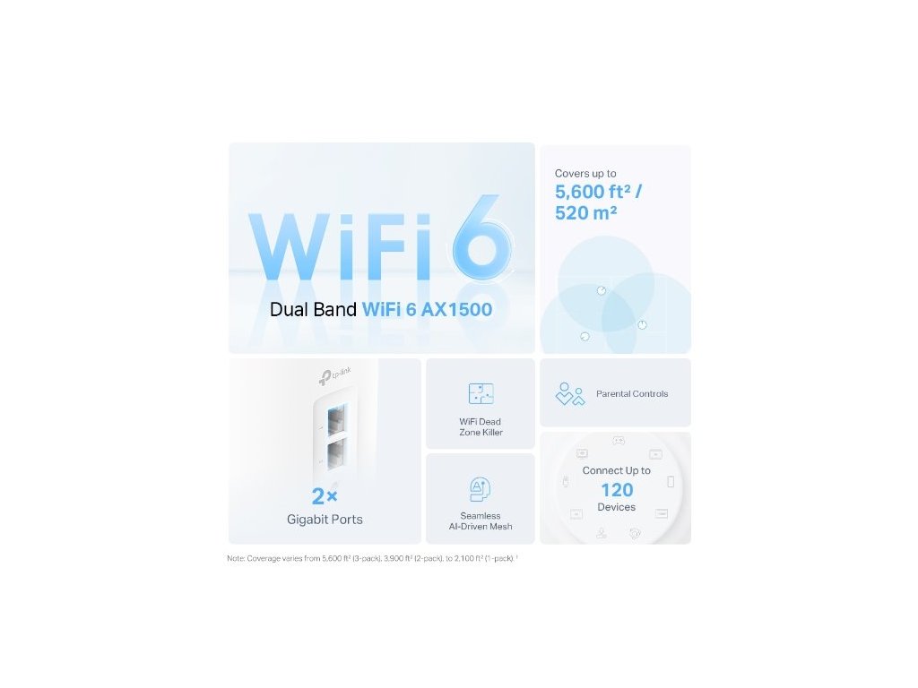 WiFi router Deco X10 (2-pack) od značky TP-Link pokryje plochu o velikosti až 190 m² (při použití 2 routerů až 360 m²). Vytvoří kvalitní a spolehlivou dvoupásmovou síť, kterou využijete i v místech s hustým provozem a velkými nároky na připojení. V pásmu 5 GHz vám router poskytne rychlost až 1 201 Mbps a v pásmu 2,4 GHz až 300 Mbps.