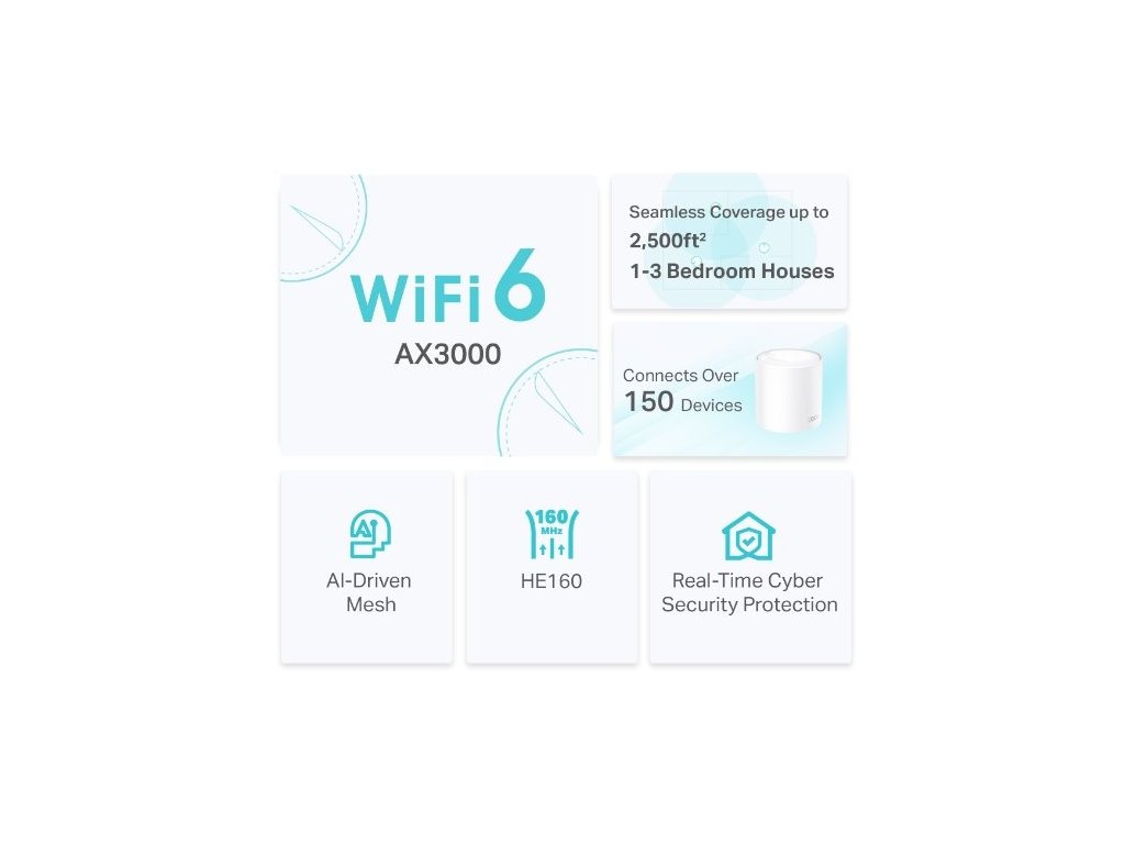 Technologii Wi-Fi 6 si oblíbíte. Jde totiž o systém navržený tak, aby pokryl celou domácnost a zaručil větší rychlost a 4x vyšší kapacitu. Zároveň k němu připojíte více než 150 zařízení a užijete si luxus, který vám Deco X50 poskytne. Funkce BSS Color a technologie Beamforming jednotce zvyšují výkon. Bezdrátové a volitelné připojení ethernet spolupracují a propojují jednotky Deco, které vlastníte. Rozšiřte svůj router Deco X50 o další a získáte ještě větší pokrytí bez omezení výkonu.