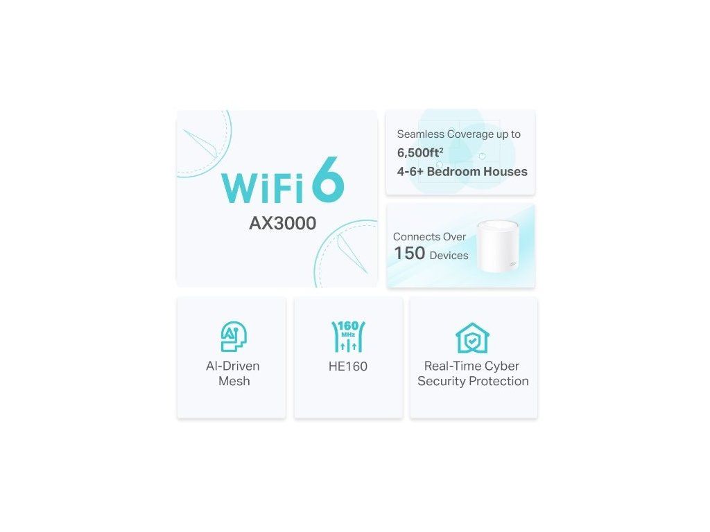 Technologii Wi-Fi 6 si oblíbíte. Jde totiž o systém navržený tak, aby pokryl celou domácnost a zaručil větší rychlost a 4x vyšší kapacitu. Zároveň k němu připojíte více než 150 zařízení a užijete si luxus, který vám Deco X50 poskytne. Funkce BSS Color a technologie Beamforming jednotce zvyšují výkon. Bezdrátové a volitelné připojení ethernet spolupracují a propojují jednotky Deco, které vlastníte. Rozšiřte svůj router Deco X50 o další a získáte ještě větší pokrytí bez omezení výkonu.