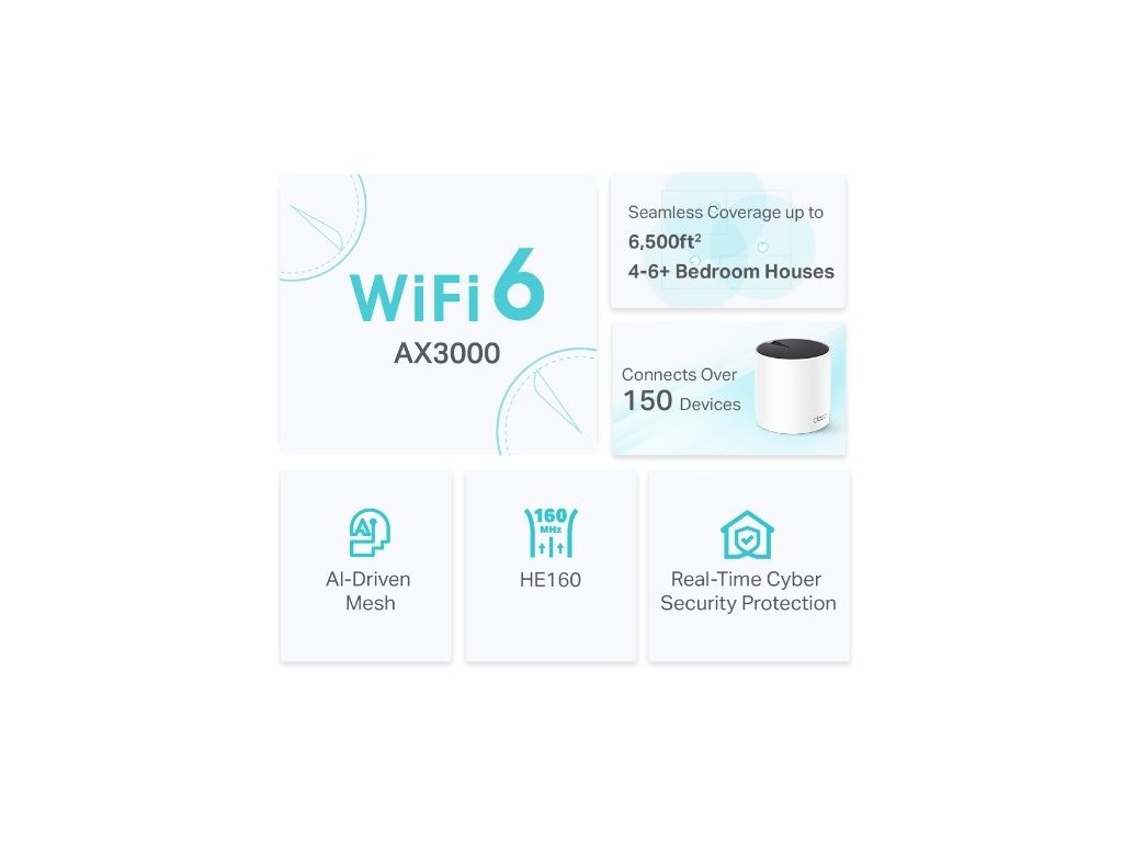 - Vybavení WiFi: TP-Link Mesh Technology, AI-Driven Mesh, 4x anténa (2x interní), Beamforming