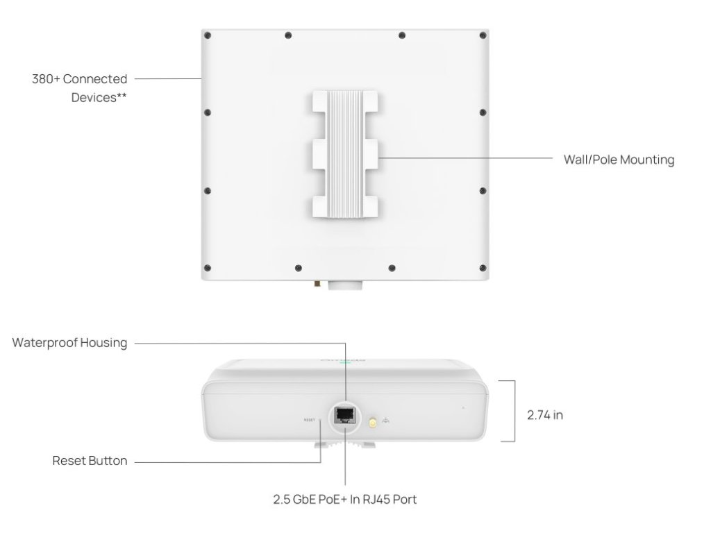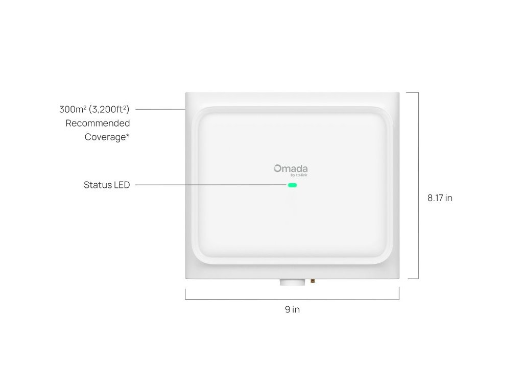 Venkovní Wi-Fi router s Wi-Fi 6, rychlost 3 Gb/s, IP68 krytí, směrové antény, PoE+, mesh, Omada SDN, venkovní použití.