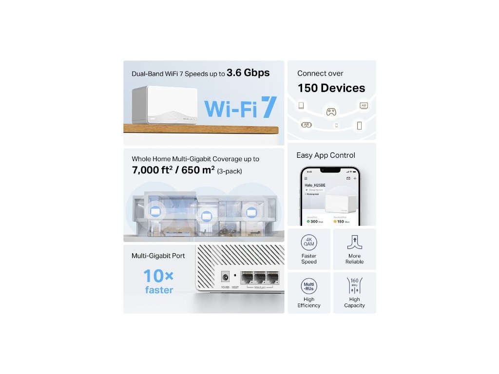 Pomocí routeru TP-Link Mercusys Halo H25BE nerušeně streamujete ve 4K/8K kvalitě a plynule hrajete AR/VR hry s rychlostí až 3,6 Gb/s (2 880 Mb/s v pásmu 5 GHz a 688 Mb/s v pásmu 2,4 GHz). Technologie WiFi 7 totiž posune výkon vašeho domácího připojení na další úroveň. V balení najdete 2 jednotky, které vám zajistí spolehlivé pokrytí (až 460 m2).