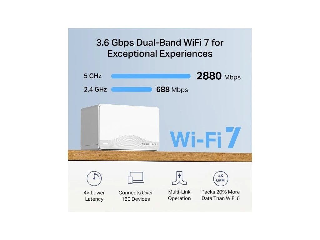 Pomocí routeru TP-Link Mercusys Halo H25BE nerušeně streamujete ve 4K/8K kvalitě a plynule hrajete AR/VR hry s rychlostí až 3,6 Gb/s (2 880 Mb/s v pásmu 5 GHz a 688 Mb/s v pásmu 2,4 GHz). Technologie WiFi 7 totiž posune výkon vašeho domácího připojení na další úroveň. V balení najdete 3 jednotky, které vám zajistí spolehlivé pokrytí (až 650 m2).