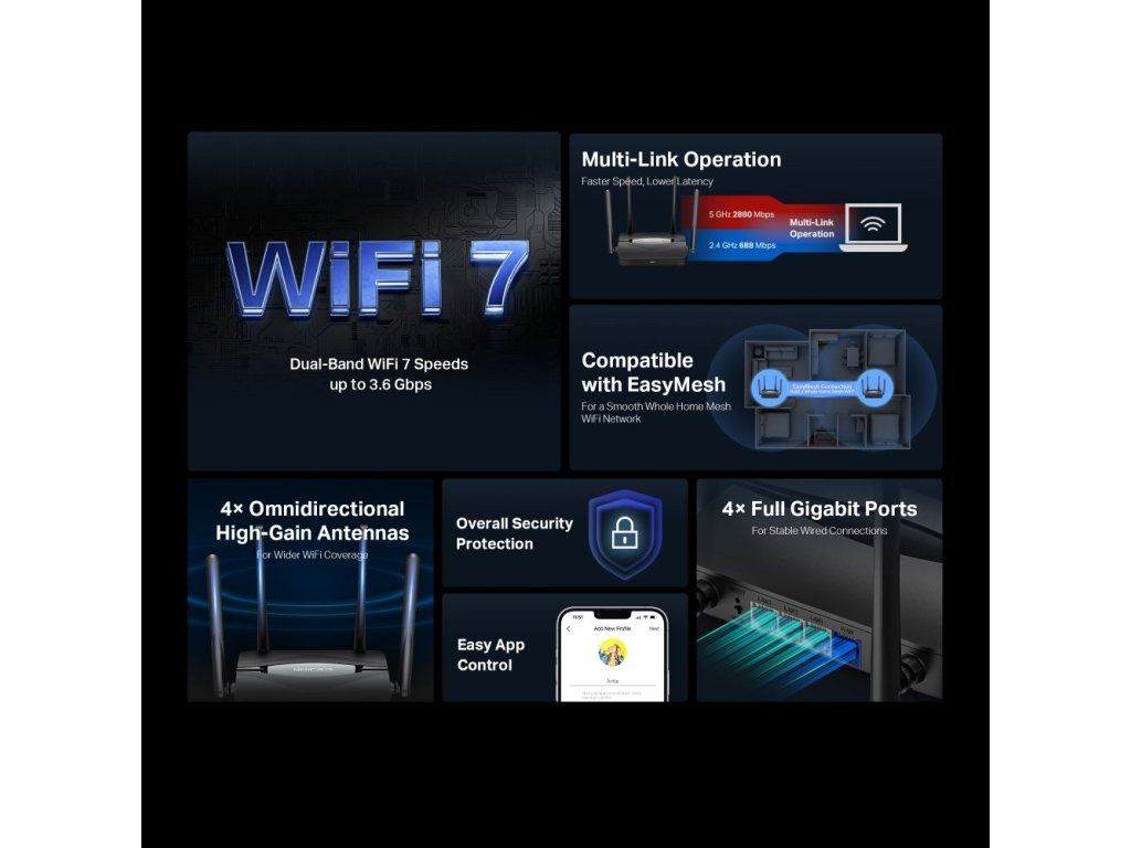 - Bleskově rychlé třípásmové připojení WiFi 7 – celková rychlost až 3,6 Gb/s