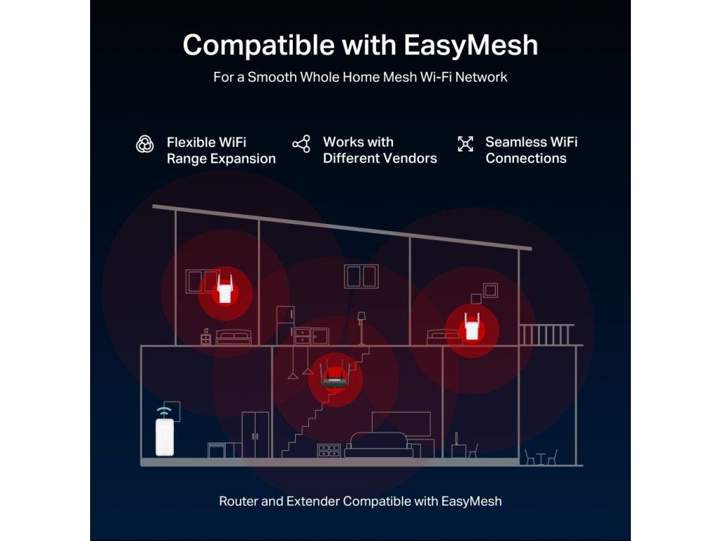 - Kompatibilita se systémem EasyMesh – vytvoření jednotné sítě