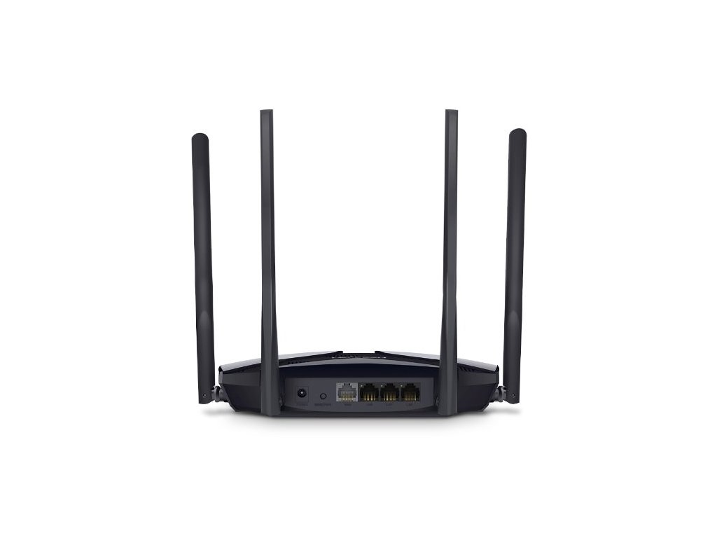 Dual-Band Wi-Fi 6 Router s 4 fixními anténami se ziskem 5 dBi, třemi Gigabitovými LAN a jedním Gigabitovým WAN portem. 2x2 MIMO, podpora MU-MIMO, 2,4 + 5 GHz pásmo 574 a 1201 Mbps, IPv6.