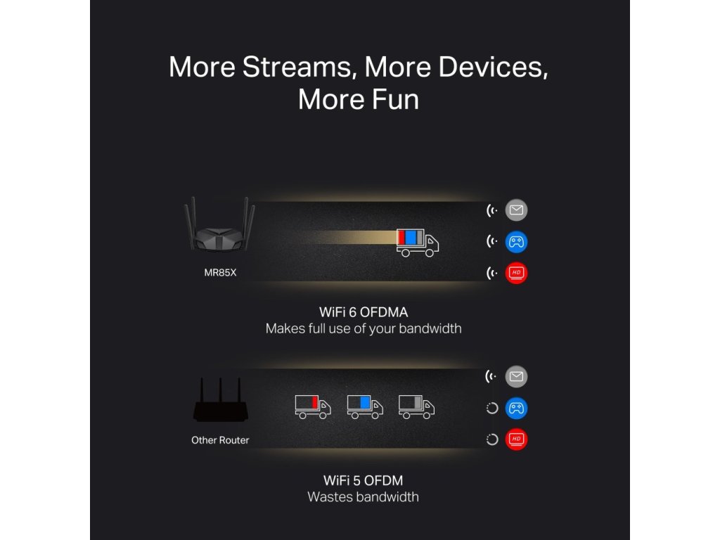 Na routeru najdete čtveřici všesměrových antén, které zajišťují silný Wi-Fi signál díky integrovaným zesilovačům signálu. Ten proniká zdmi lépe, než u obyčejných routerů. Jednotka podporuje technologie OFDMA a MU-MIMO pro posílení vaší Wi-Fi sítě a umožňuje více klientům přenášet data současně. Těšit se můžete na až čtyřnásobně vyšší průměrnou propustnost.