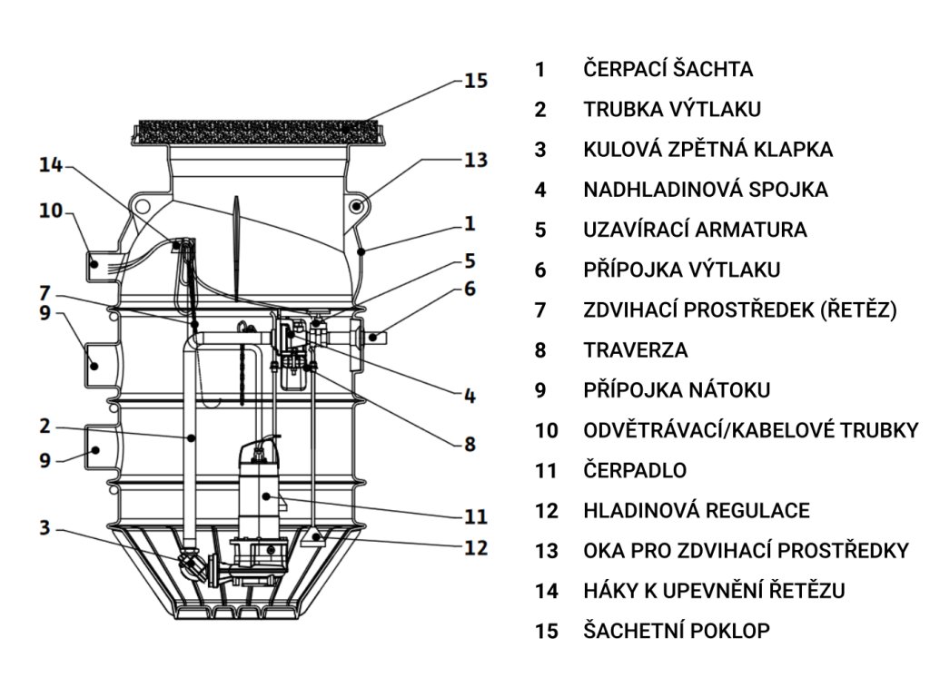 Plastová šachta s kompletním osazením potrubím a armaturami připravená pro použití s jedním čerpadlem. Slouží k přečerpávání odpadní vody s fekáliemi i bez nich, která nemůže být odváděna samospádem přímo do kanalizace, nebo pro odvodňování míst, která jsou pod úrovní hladiny zpětného vzdutí. Hodí se tak všude tam, kde není k dispozici kanalizace, nebo není možné její zbudování. Šachta se umisťuje přímo do půdy.
