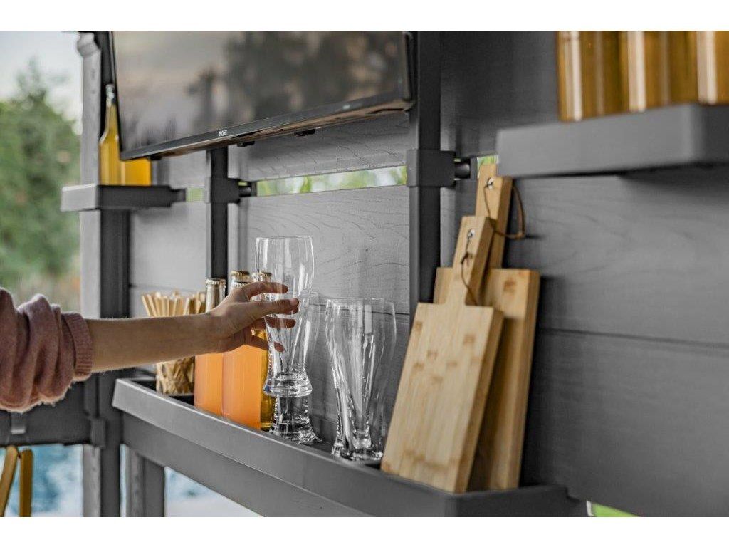 Altán Keter BAR-B-Q Gazebo využijete jako přístřešek nad grilem i jako venkovní bar pro pohodlné servírování nápojů a občerstvení. Součástí konstrukce je barový pult ve výšce 105 cm, který poskytuje dostatek prostoru pro přípravu i podávání. K dispozici máte celkem 5 polic, z toho čtyři menší s nosností 2 kg a jednu větší s nosností 6 kg. Samotný barový pult unese až 20 kg, takže na něj bez obav odložíte nádobí, nápoje i připravené jídlo. Praktické držáky na sklenice udrží vše přehledně uspořádané a konstrukce umožňuje také umístění televize pro ještě lepší atmosféru při setkání s přáteli.