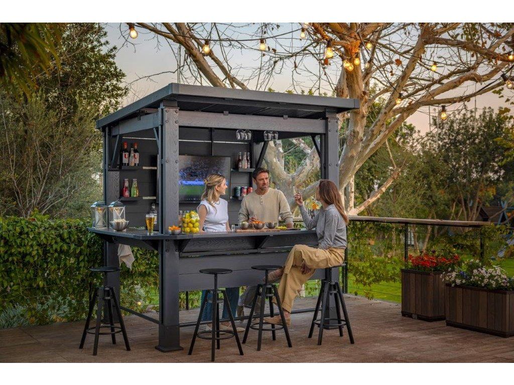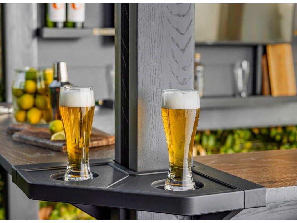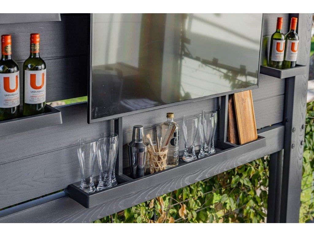 Altán Keter Bar Gazebo využijete jako venkovní bar pro servírování nápojů i občerstvení. Součástí konstrukce je barový pult ve výšce 105 cm, který poskytuje dostatek prostoru pro přípravu i podávání. K dispozici máte celkem 5 polic, z toho čtyři menší s nosností 2 kg a jednu větší s nosností 6 kg. Samotný barový pult unese až 20 kg, takže na něj bez obav odložíte nápoje, sklenice i další vybavení. Praktické držáky na sklenice udrží vše přehledně uspořádané a konstrukce umožňuje také umístění televize pro ještě lepší atmosféru při sledování sportovních přenosů nebo oblíbených pořadů.