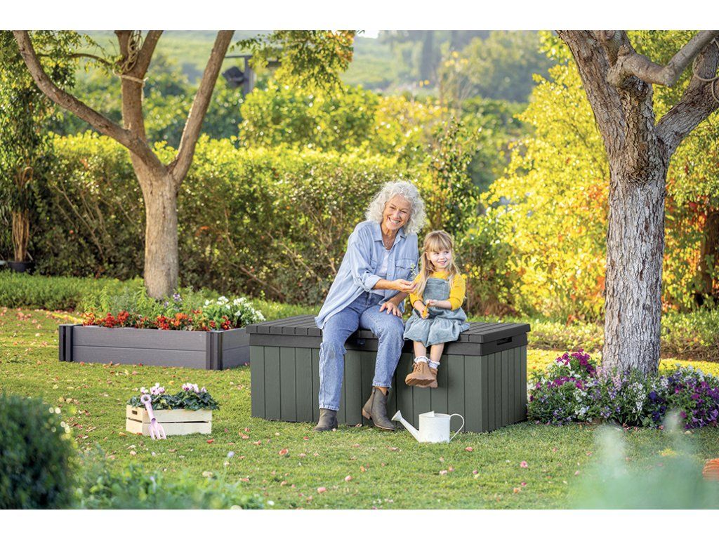 Najděte pro box ideální místo na zahradě. Díky struktuře, která připomíná dřevo, zapadne do každého prostředí. Uložené věci navíc můžete uzamknout uvnitř boxu. Hydraulický pístový systém zajistí plynulé a bezpečné zavírání a otevírání víka. Po zavření se na něj navíc usadí až 2 lidi.