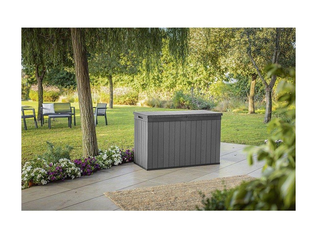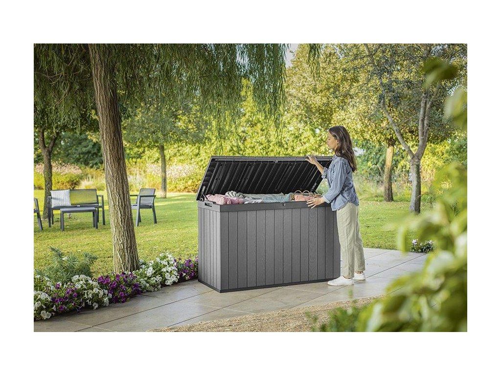 Najděte pro box ideální místo na zahradě. Díky struktuře, která připomíná dřevo, zapadne do každého prostředí. Uložené věci navíc můžete uzamknout uvnitř boxu. Hydraulický pístový systém zajistí plynulé a bezpečné zavírání a otevírání víka. Po zavření se na něj navíc usadí až 2 lidi.
