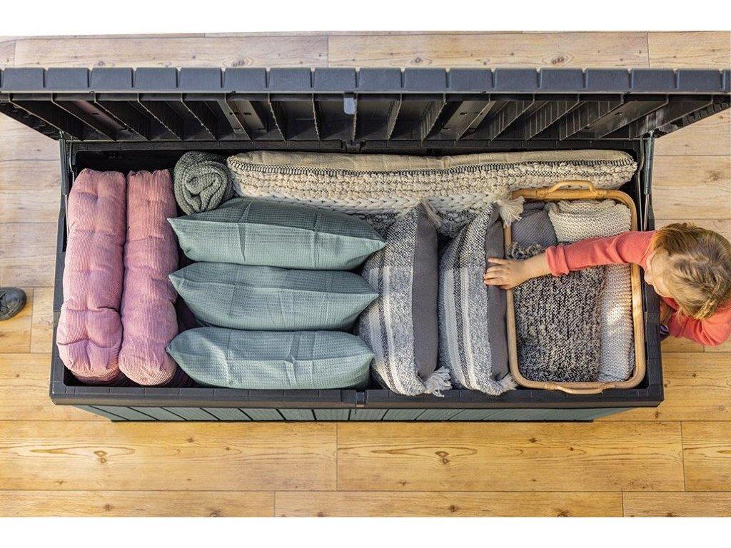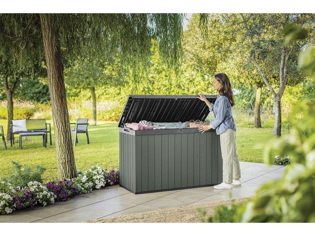 Najděte pro box ideální místo na zahradě. Díky struktuře, která připomíná dřevo, zapadne do každého prostředí. Uložené věci navíc můžete uzamknout uvnitř boxu. Hydraulický pístový systém zajistí plynulé a bezpečné zavírání a otevírání víka. Po zavření se na něj navíc usadí až 2 lidi.