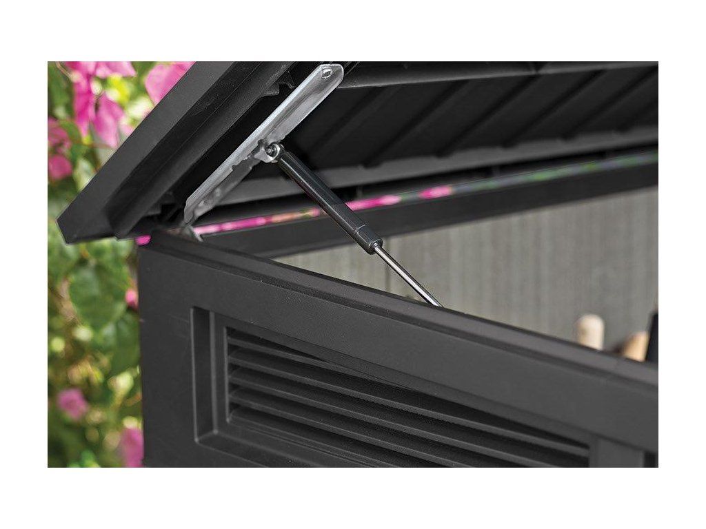 Zahradní box je vybavený podlahou a dvojitými dvířky. Snadno a bez přebytečné námahy dovnitř umístíte i větší předměty. Do boxu se ovšem dostanete i z horní strany. Otevřete víko pomocí hydraulických pístů a nerezových kovových pantů s úhlem až 180°.