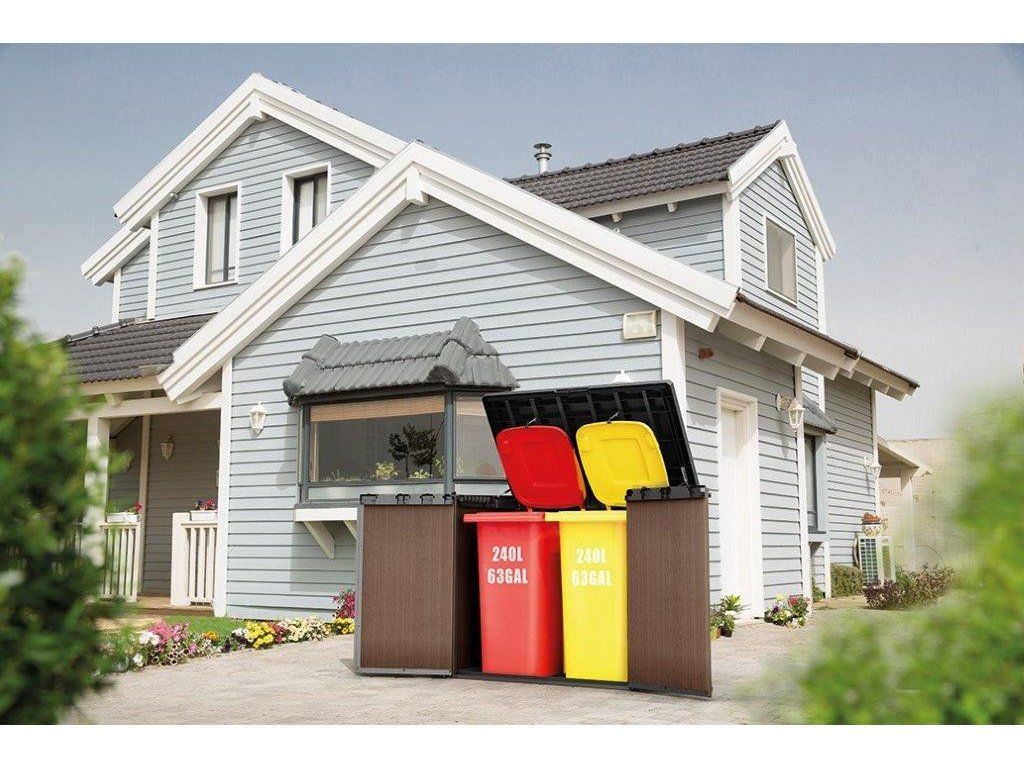 Do boxu nainstalujete v případě potřeby police (nejsou součástí balení). Klidně místo nich použijte dřevěné prkno a přichyťte ho za úchyty, které najdete v balení. Do boxu se vejdou dvě popelnice, každá o objemu 240 l. Pokud je uchováváte v boxu, můžete namontovat řetízky s háčky, abyste uchytili víka popelnice k jeho horní části. Zjednodušíte si jejich otevírání a zavírání.