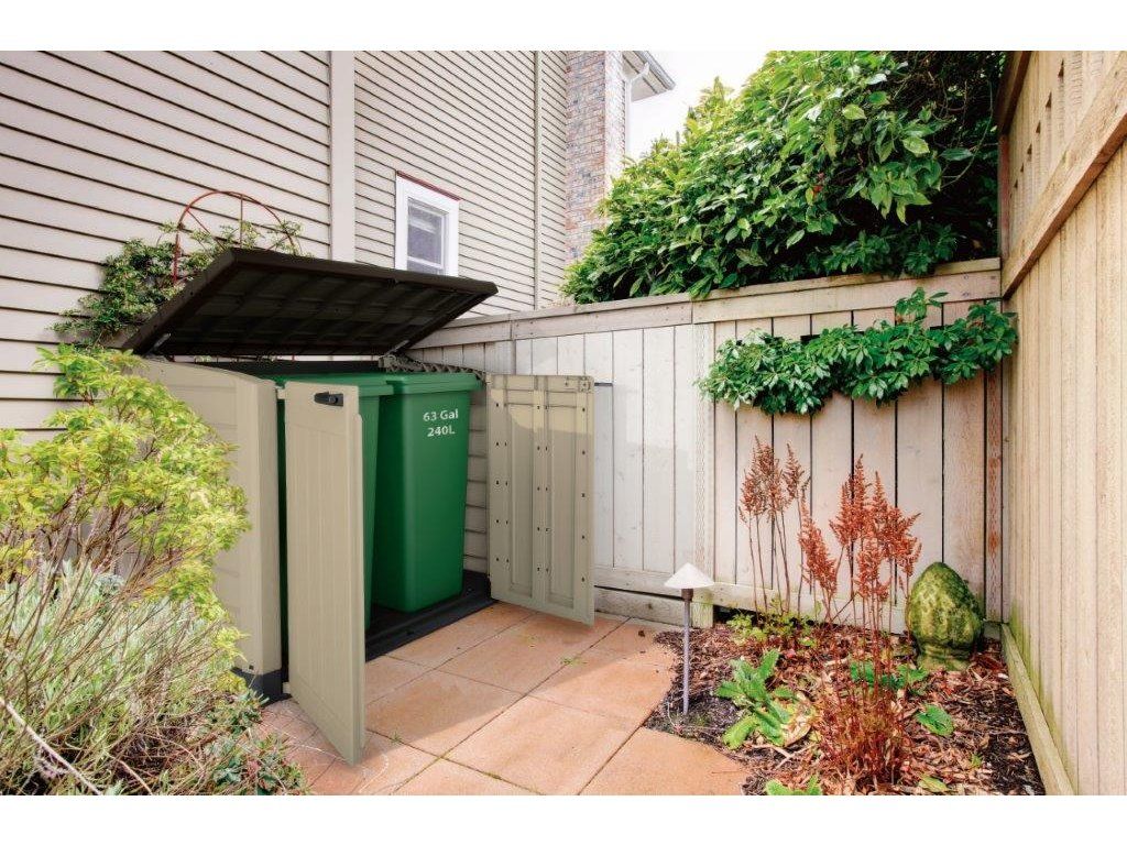 Široké 2křídlé dveře jsou ze shora uzamykatelné pomocí šroubu a zespodu prostřednictvím zámku. Uživatelé, kteří bydlí v rušných čtvrtích, si tak mohou obsah přístřešku pojistit přídavným visacím zámkem, čímž se sníží riziko krádeže popelnice či jiného příslušenství. Přístřešek je vyrobený z vysoce kvalitní polypropylenové pryskyřice v moderním designu, který imituje strukturu přírodního dřeva. Stěny jsou vyztužené žebrovými segmenty, které hravě odolají i drsnému zacházení, vandalismu, extrémnímu počasí i UV záření.