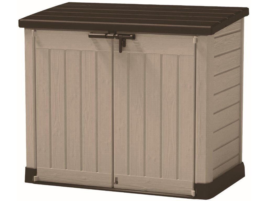 - Béžovo-hnědý přístřešek nabízí kapacitu 1200 l pro uložení popelnic, bazénové technologie a vybavení či zahradního nářadí