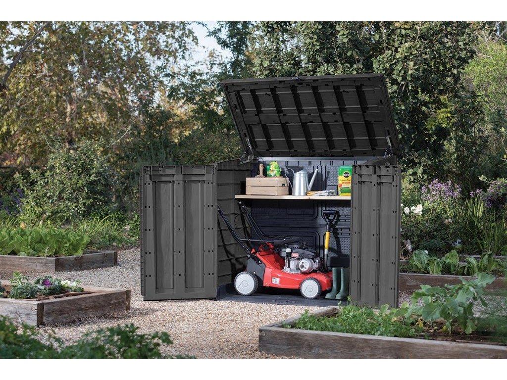 Přístřešek je vyrobený z polypropylenové pryskyřice a stěny jsou vyztužené žebrovými segmenty, díky čemuž bez problému odolá i náročnému zacházení. Dvoukřídlé dveře lze zamknout horním šroubem i spodním zámkem, a pro ještě vyšší zabezpečení můžete použít přídavný visací zámek.