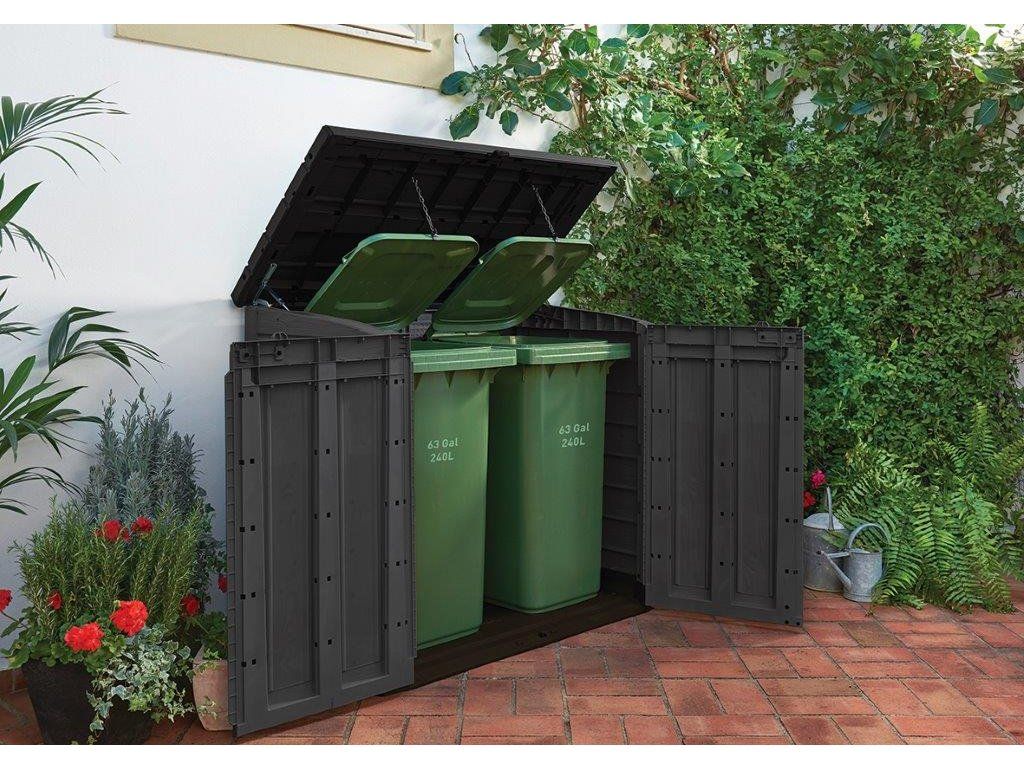- Tmavě šedý přístřešek nabízí kapacitu 1200 l pro uložení popelnic, bazénové technologie a vybavení či zahradního nářadí