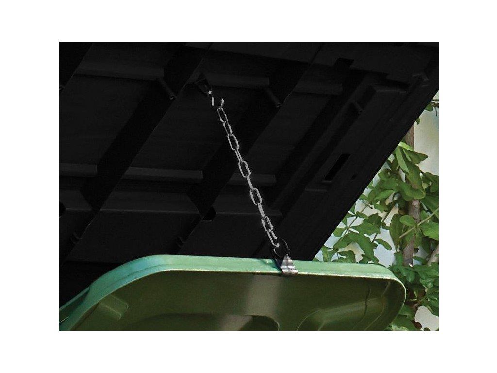 Horní víko přístřešku je vybavené automatickým systémem otevírání pomocí hydraulických pístů a kovové vzpěry udrží víko otevřené pro pohodlné plnění. Zešikmený práh výrazně usnadňuje manipulaci s popelnicemi na kolečkách. Využít můžete také možnost vodorovné instalace polic pomocí přiložených konzol a úchytů – každá police má nosnost až 20 kg.
