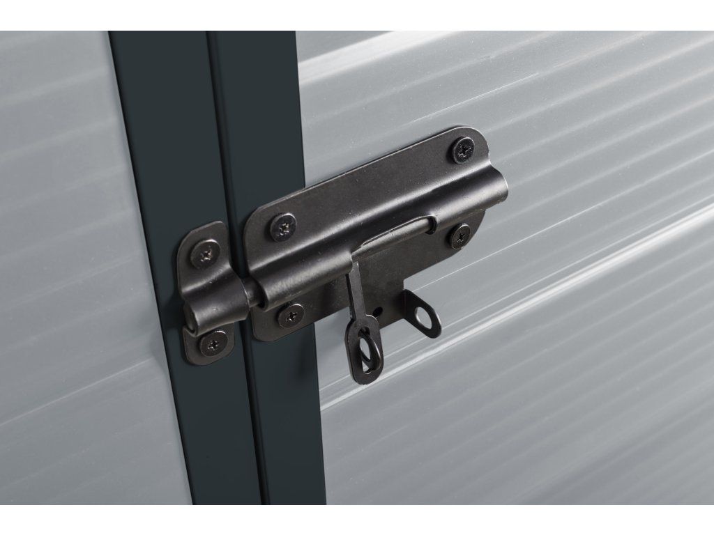 Nad dvoukřídlými dveřmi je umístěna ventilační mřížka, která zajišťuje dostatečné odvětrávání a cirkulaci vzduchu uvnitř domku. Proto se nemusíte bát plísní nebo srážení vody na stěnách v případě náhlých změn teploty.