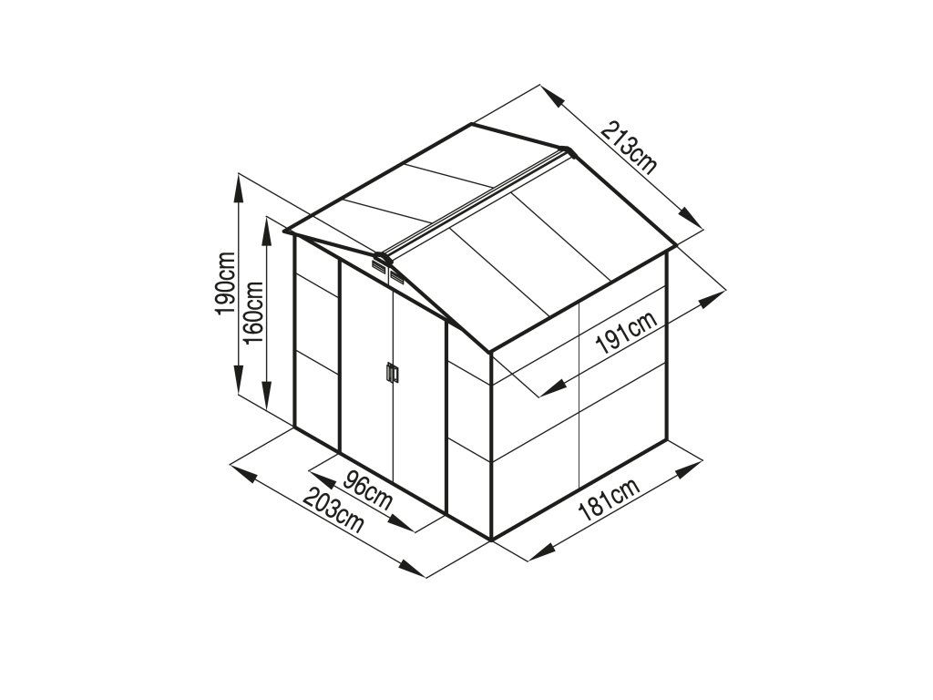 Šířka přední strany činí 213 cm, výška v nejvyšším bodě je 190 cm a šířka boční strany je 191 cm. Výška boční stěny bez střechy je 163 cm. Na přední straně se nachází dveře.