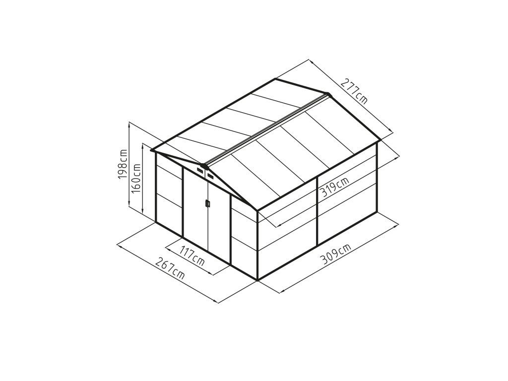 Šířka přední strany činí 277 cm, výška v nejvyšším bodě je 198 cm a šířka boční strany je 319 cm. Výška boční stěny bez střechy je 163 cm. Na přední straně se nachází dveře.