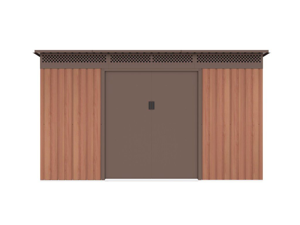 Zahradní domek GRAH 1132 má dvoukřídlé dveře o celkové šířce 138 cm. Vstup do domku je tak opravdu pohodlný, i když nesete nebo vynášíte objemnější věc.