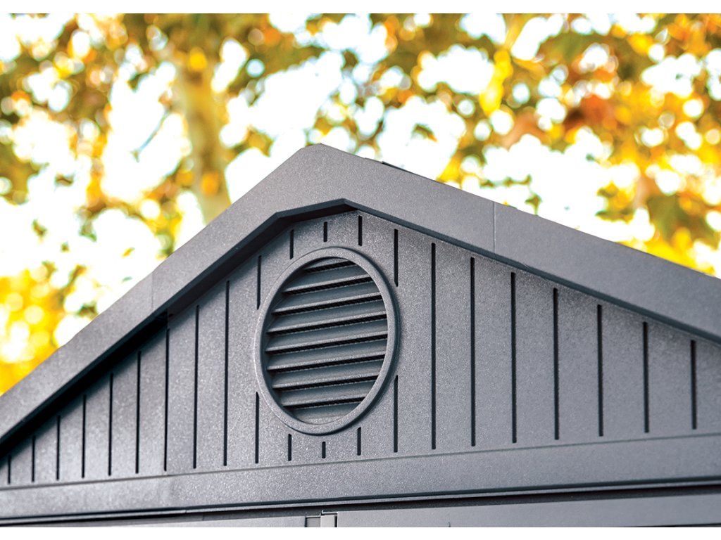 Zahradní domek Keter Darwin je vybavený silnou sedlovou střechou, která vydrží zatížení až do 75 kg/m², takže hravě odolá i haldě sněhu. Má dvojité dveře, takže dovnitř uskladníte i rozměrnější věci – gril nebo třeba kolečko. Výrobce se také postaral o vhodný ventilační systém s regulovanou cirkulací vzduchu. Přední dveře jsou opatřeny ocelovou západkou, na kterou lze nasadit visací zámek pro větší bezpečnost.