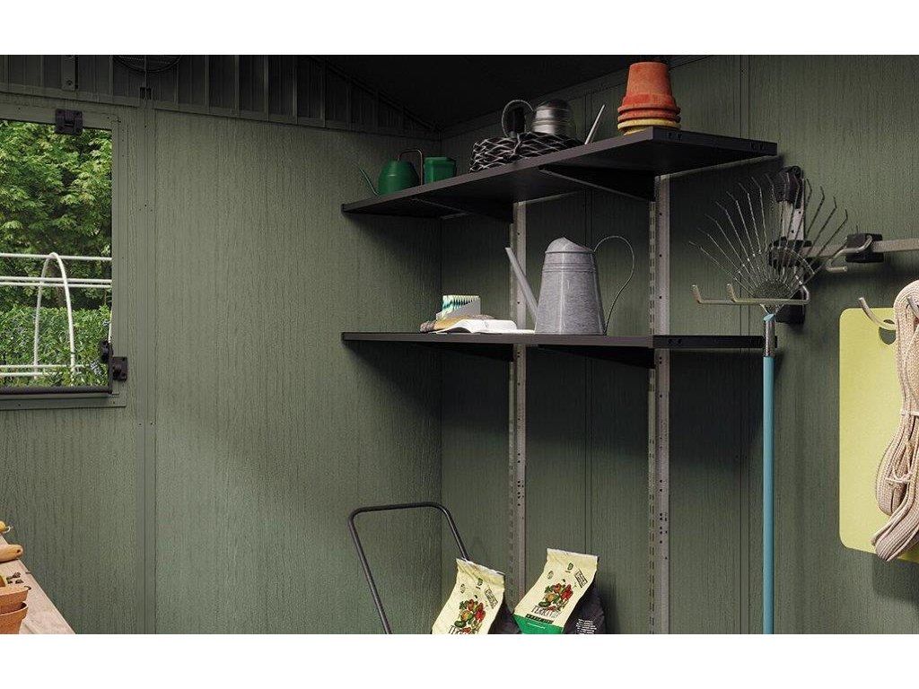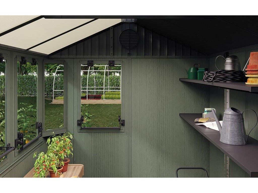 Chcete v domku rozšířit úložný prostor? Namontujte dovnitř 2 police (jsou součástí balení). Uskladníte na ně drobnější pomůcky a předměty. Kromě toho kdykoliv vyvětráte. O cirkulaci vzduchu se postará celkem 5 oken (s možností otevření na 7°).