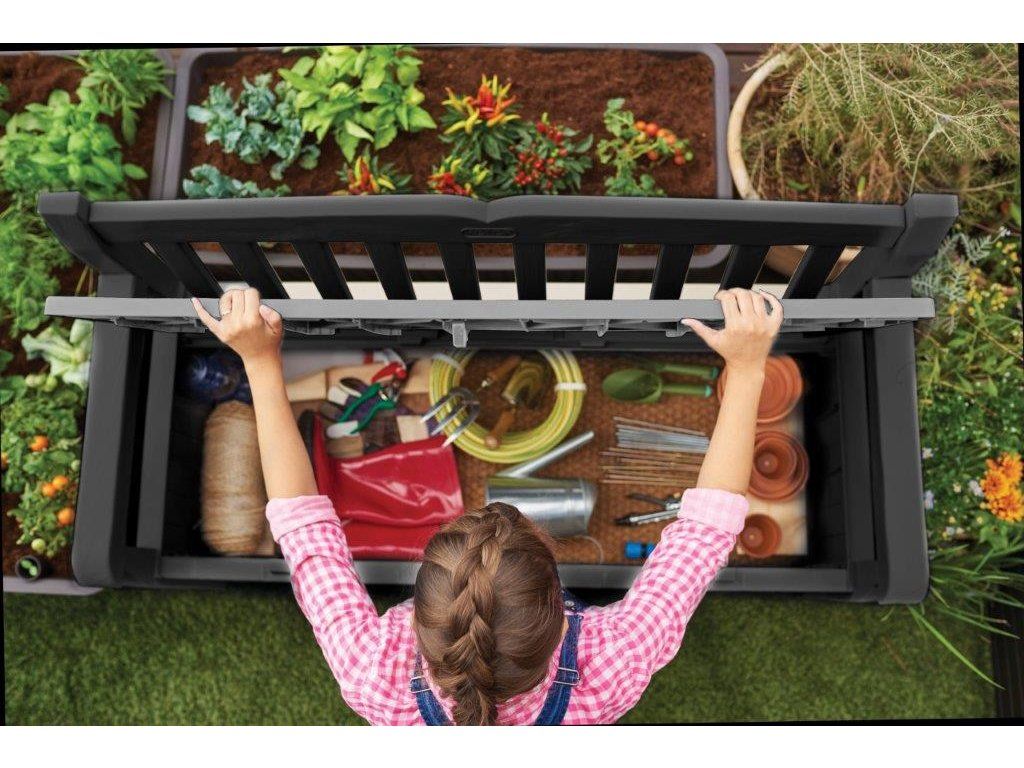 Lavice Keter Eden Garden Bench se však dá využít také jako praktický úložný prostor se štědrou kapacitou až 265 l. Ten najde své uplatnění při skladování podsedáků, polštářů, zahradního i dílenského nářadí či dětských hraček, o které tak už nebudete zakopávat při procházce po vašem dvoře či zahradě.
