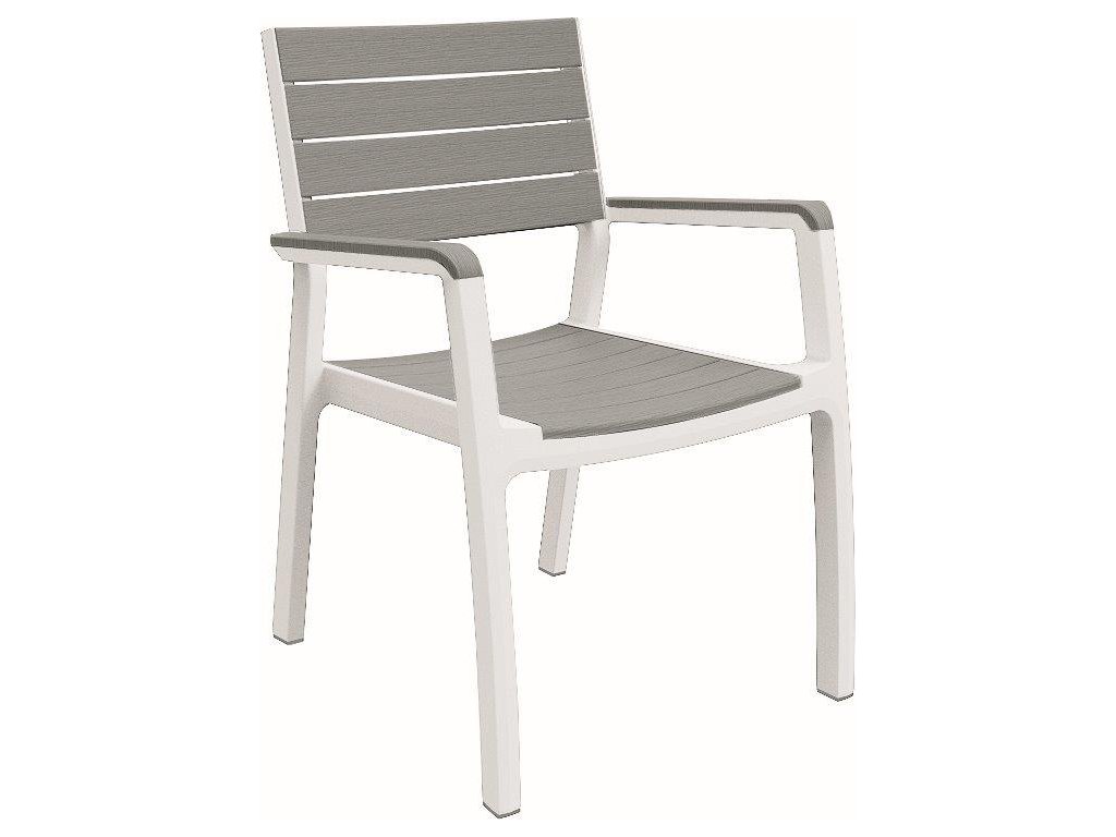 Zahradní židle Keter Harmony s čistě bílým rámem a šedými prkny připomínajícími dřevo jsou velmi pohodlné a díky promyšlené konstrukci i loketním područkám se v nich budete cítit jako v křeslech.