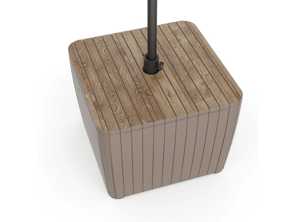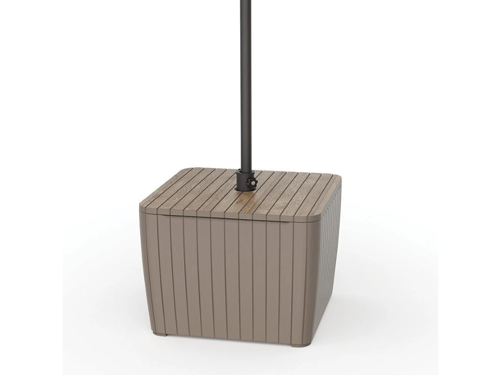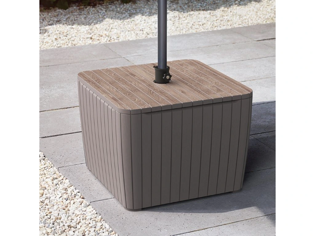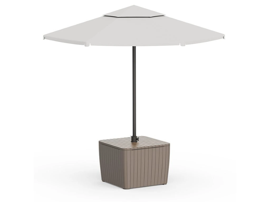 Integrovaná nádrž o objemu 40 l po naplnění zajistí vysokou stabilitu stolu i při použití se slunečníkem. Praktický držák umožňuje umístění slunečníku s průměrem až 3 m, což oceníte zejména během horkých letních dnů. Díky rozměrům 57 x 43 x 57 cm se stůl skvěle hodí i do menších prostor, jako jsou balkony nebo menší terasy. Plastové provedení je odolné vůči povětrnostním vlivům i UV záření a zároveň se velmi snadno udržuje.
